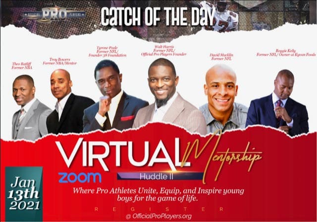 We’ve all heard and believe in the old saying “it takes a village to raise a child”. Every day it gets harder for our young boys to find balance in a world that easily diverts his attention from success. Official Pro Players want to help be a resource for young boys. Because Pro Athletes from all sports recognize the power of the “Huddle”, help us help our young boys become strong men with our Catch of The Day Mentorship Huddle. This program will be a place where camaraderie, trust, support, and focus is harnessed in order to achieve one’s ultimate goal to succeed. Young boys from middle school to high school will have the opportunity to listen, speak with other pro athletes and professionals to help equip him to become all he’s created to be.